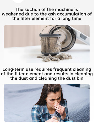 - Long-term use requires frequent cleaning of the filter element and results in cleaning the dust and cleaning the dust bin.