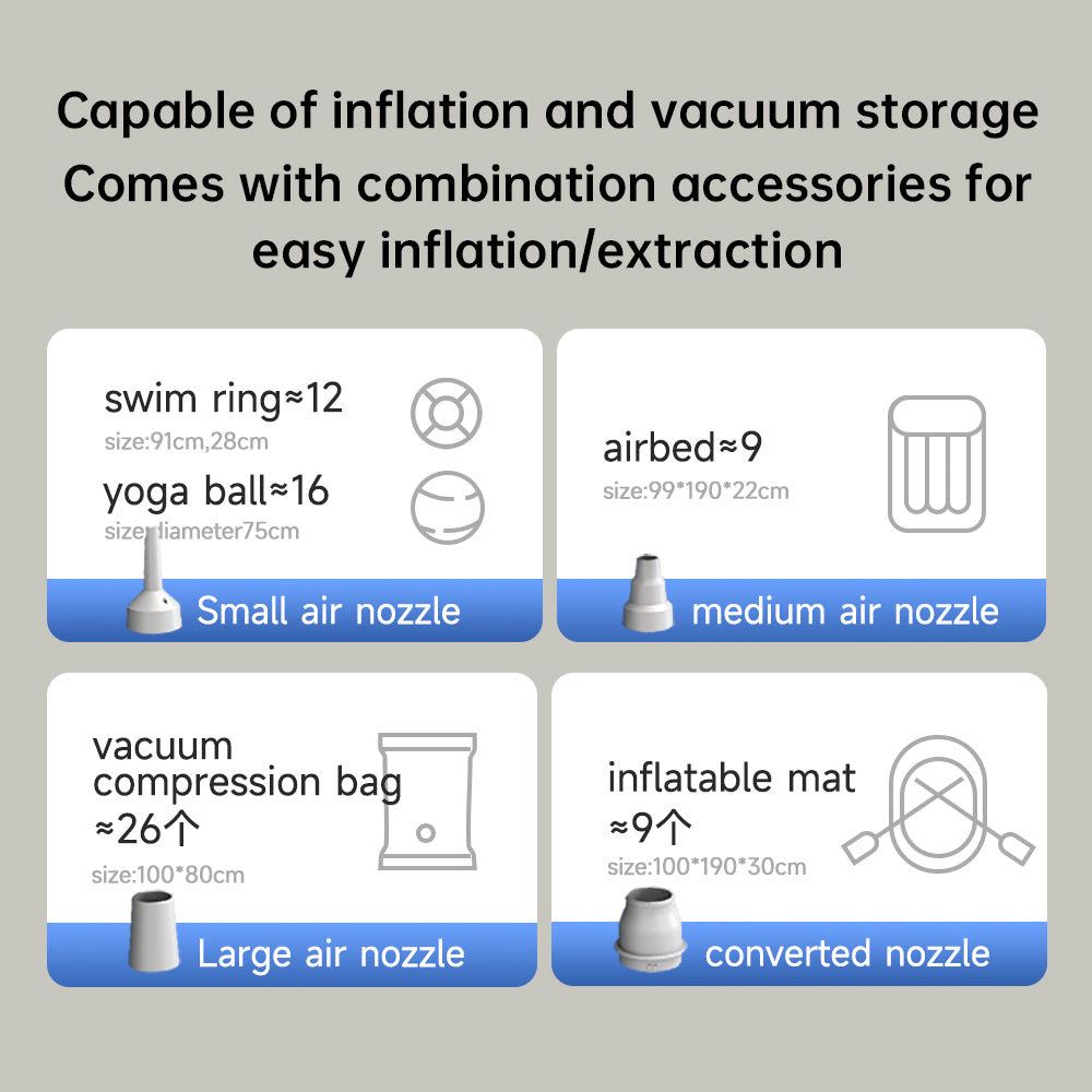 In the self-cleaning mode, you can replace the blowing accessories to pump inflatable items, outdoor inflatable sofas, inflatable tents, swimming rings, etc. It's not just a vacuum cleaner, also a pump.